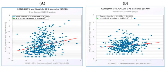 Correlation between KCNQ1OT1 and ELAVL3 in stomach adenocarcinoma (A). KCNQ1OT1has a significant positive correlation with CALCR expression in stomach adenocarcinoma (B). The bioinformatics analysis presented in this figure was performed using starBase (http://starbase.sysu.edu.cn).