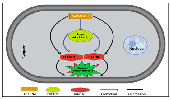 Through the integration of mRNA-miRNA and miRNA-lncRNA interactions, we identified a specific network (ELAVL3/CALCR-hsa-mir-29a-3p-KCNQ1OT1) associated with the prognosis of STAD (Figure 8 and Figure 9). This network aligns with the previously established roles of hsa-mir-29a-3p and KCNQ1OT1 in various cancers.
