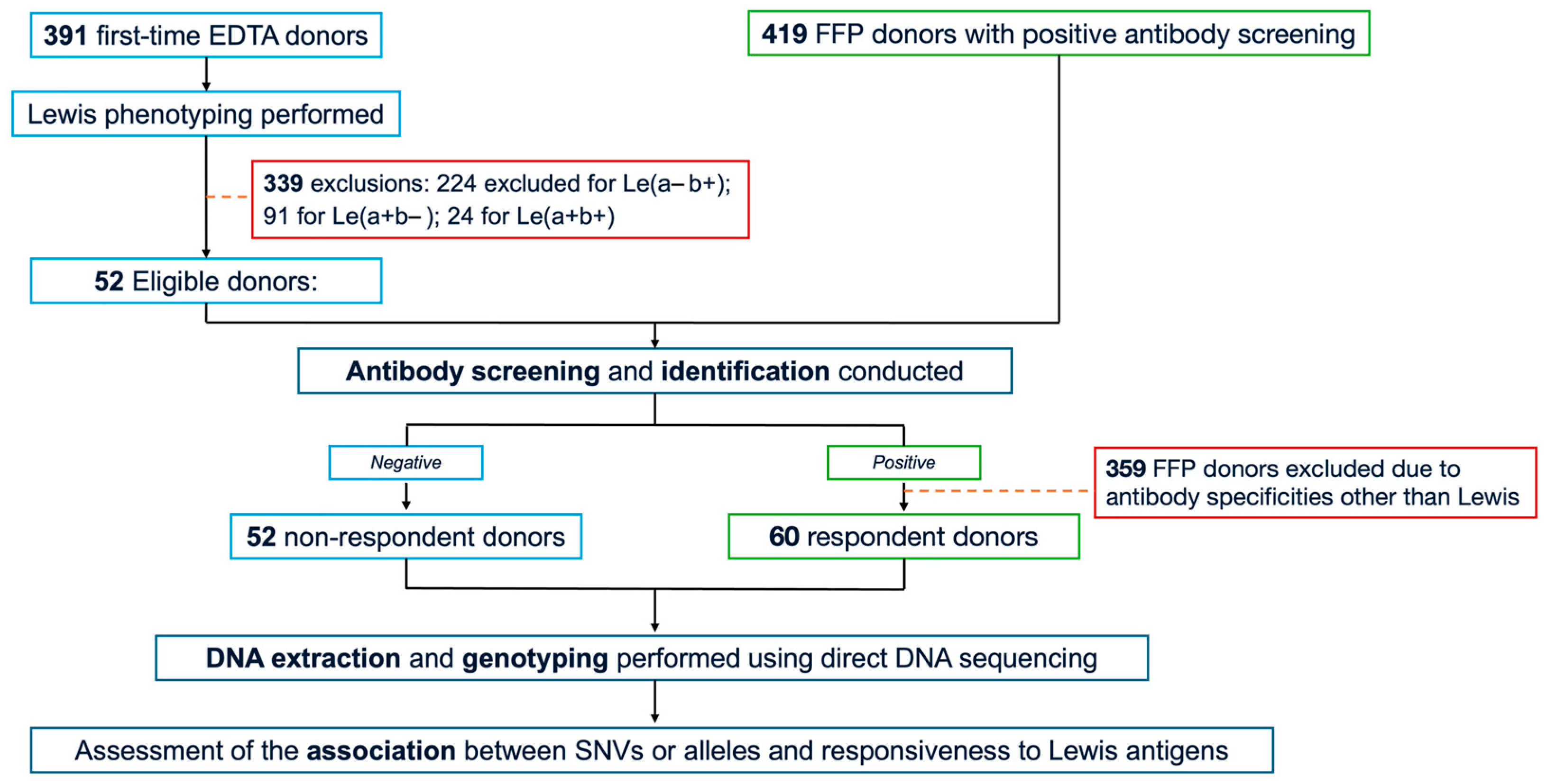 The study cohort comprised 112 randomly selected, unrelated Thai blood donors exhibiting the Le(a–b–) phenotype. From September to October 2024, 391 first-time donors were recruited from the Blood Bank Unit, Thammasat University Hospital (TUH), following informed consent. Whole peripheral blood samples anticoagulated with ethylenediaminetetraacetic acid (EDTA) were collected from all participants, and serological testing—including Le phenotyping and antibody screening—was subsequently performed. As a result, only 52 Le(a–b–) donors who were non-responders for Le antibodies were included in the study. In addition, 419 donors with positive antibody screens, collected from Fresh Frozen Plasma (FFP) donors between August 2022 and May 2025 at the National Blood Centre, Thai Red Cross Society, Bangkok, Thailand (NBC-TRC), underwent further antibody screening and identification. Of these, 60 FFP donors met the eligibility criteria for the study and were categorised as the responder group. Serum samples were immediately isolated and stored at −20 °C until testing. Demographic variables, including age, sex, and ABO blood group, were obtained from the TUH donor database. The complete study workflow is illustrated in Figure 2.