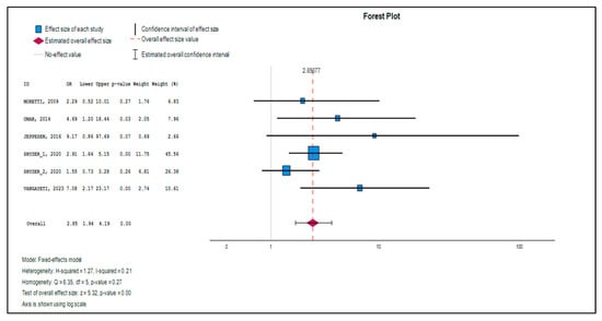 The evaluation employed the log odds ratio to measure outcomes, with results later converted back to odds ratio. A random-effects model was utilized for the dataset. Statistical analysis followed a dichotomous approach, using a random-effects model to compute the log odds ratio (LogOR) and then back-transforming it to odds ratio (OR) with a 95% confidence interval (CI = 95%) []. Heterogeneity among studies was assessed using measures such as I2, the Q statistic, and H2 []. The I2 statistic ranges from 0% to 100%, where 0% indicates no heterogeneity, less than 25% indicates low heterogeneity, 25–50% indicates moderate heterogeneity, 50–75% indicates high heterogeneity, and 75% or more indicates very high heterogeneity. A significance level of 10% rather than 5% is recommended for the Q statistic. Complete uniformity is indicated by H = 1, with a theoretical range from one to infinity. Heterogeneity is considered significant at the 5% level if the 95% confidence interval for the H statistic does not include the null value (one). There is no standard for classifying H2 as mild, moderate, or severe [].