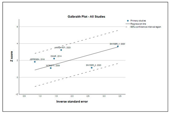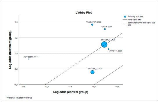 Additionally, a Galbraith plot was constructed to assess the level of heterogeneity among the studies in the meta-analysis. In this plot, the y-axis shows the (log-transformed) effect size divided by its standard error (z score), while the x-axis represents the inverse of the standard error []. A L’Abbé plot was also used to examine heterogeneity among studies, plotting the risks (or odds) of the exposed or index group on the y-axis against those of the control group []. Publication bias was initially assessed through sensitivity analysis and an influence graph. This involved replicating the meta-analysis results while omitting one study at a time, aiming to verify the consistency of outcomes in terms of direction, effect size, and statistical significance, thereby demonstrating the robustness of the analysis []. If statistically significant bias was found (p > 0.1), a “trim and fill” analysis was performed to estimate the number of additional studies needed to correct for publication bias, and the revised effect size was compared with the original to check for significant differences [].