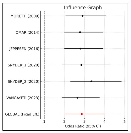 The sensitivity analysis (Table 9 and Figure 8) also confirmed that our findings are robust. This analysis evaluates the stability of the overall result by removing each study one by one. Table 9 shows the meta-analysis results when each study is omitted individually. It was observed that the combined odds ratio remained consistently above the null value (OR = 1), which demonstrates that no single study has a disproportionate influence on the result.