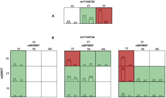 Diagram of interaction models of genotypes of polymorphic variants of genes involved in connective tissue metabolism relative to joint hypermobility. Note: Here and hereafter: red cells represent high-risk combinations, green cells represent low-risk combinations, and white cells indicate missing genotype combinations. For each cell, the left column corresponds to the study group with Joint Hypermobility, and the right column corresponds to the control group. (A) (the top row, which includes the genotypes for rs11144134) corresponds to a single-locus model, where the TT genotype is associated with an increased risk of JH. (B) corresponds to a three-locus model, representing a three-dimensional interaction. It includes three SNPs and their respective genotypes: rs11144134 (top horizontal axis), rs9978597 (horizontal level), and rs2290777 (vertical axis).