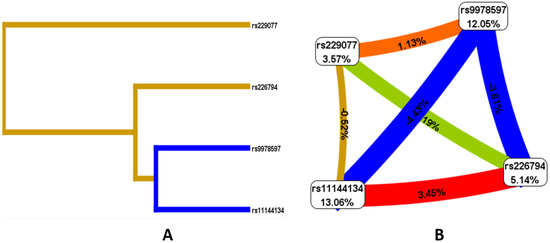 Dendrogram of intergenic interactions (A) and the Fruchterman–Reingold scheme (B) rs229077 (ADAMTS5), rs9978597 (ADAMTS5), rs226794 (ADAMTS5), and rs11144134 (TRPM6). Note: The line color indicates the type of interaction: blue represents strong antagonism, green represents moderate antagonism, brown represents additive interaction, and red represents strong synergy. The strength and direction of the interaction are expressed as a percentage of entropy, where a negative entropy value corresponds to an antagonistic interaction.