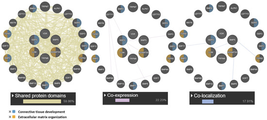 Furthermore, when the network for the ADAMTS5 gene was expanded, the functional partner ACAN was predicted based on co-expression mechanisms. Both of these genes are involved in extracellular matrix metabolism [59], and their expression has been studied in relation to various diseases, particularly most extensively in association with osteoarthritis [60].