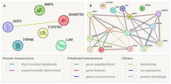 At the first stage, a protein–protein interaction model was constructed for the studied genes (Figure 4A). Interactions with a cumulative score > 0.4 (medium level) were considered statistically significant. Interactions between GDF5 and ADAMTS5 were detected (cumulative score 0.493). Subsequently, the model was expanded to search for functionally related partner genes, considering only interactions with a high cumulative score > 0.7 (Figure 4B, Table 6).