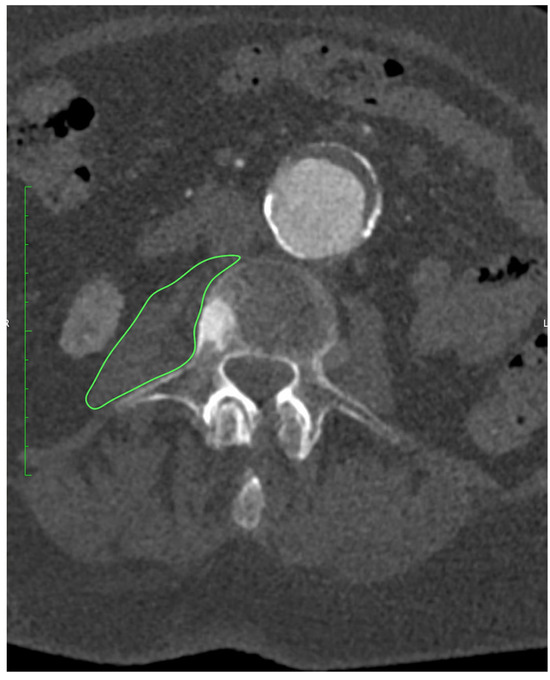 All patients underwent preoperative CTA of the aorto-iliac and femoral arteries performed at our institution. Examinations were acquired on a 128-slice scanner (SOMATOM X.cceed, Siemens Healthineers, Erlangen, Germany) using a standardized contrast-enhanced protocol (100–120 mL of iodinated contrast, injection rate 4–5 mL/s, bolus tracking in the abdominal aorta). Images were reconstructed with a slice thickness of 0.5 or 1.0 mm, depending on the reconstruction protocol used. All scans were obtained on the same scanner model. All measurements were performed preoperatively on CTA at the mid-L3 vertebral level using standardized axial sections in the arterial phase. On a representative slice, both psoas muscles were manually delineated with dedicated imaging software OsiriX MD (Pixmeo SARL, Geneva, Switzerland), version 14.1.0, and their cross-sectional surface areas (PMA, cm2) were recorded, as presented on Figure 1. From the same regions of interest, the average PMD (Hounsfield units) was determined. The PMI (cm2/m2) was derived by normalizing the combined PMA to the patient’s height squared.