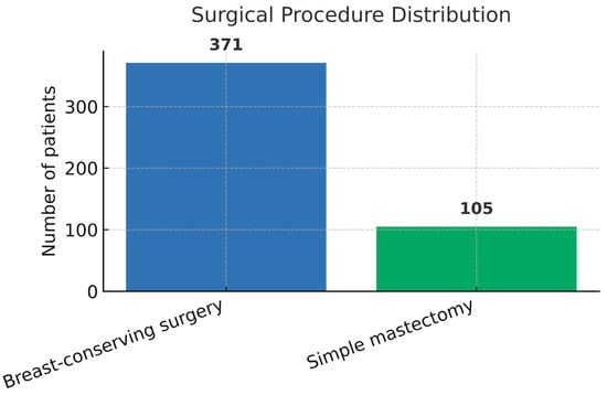 Breast-conserving surgery (BCS) was performed in 371 patients (77.9%), while simple mastectomy was performed in 105 cases (22.1%). In addition, the mean age of patients who underwent BCS was 60.2 years (SD: 11.3), respectively, 58.2 years (SD: 10.5) for those who received mastectomy, with no statistically significant difference between the two groups (p = 0.054, independent samples t-test). A detailed representation of demographic and surgical characteristics is presented in Table 1 and Figure 1.