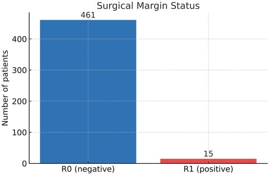 Bar chart showing the status of surgical margins. Negative margins (R0) were achieved in 96.8% of patients (n = 461), while positive margins (R1) were identified in 3.2% (n = 15).