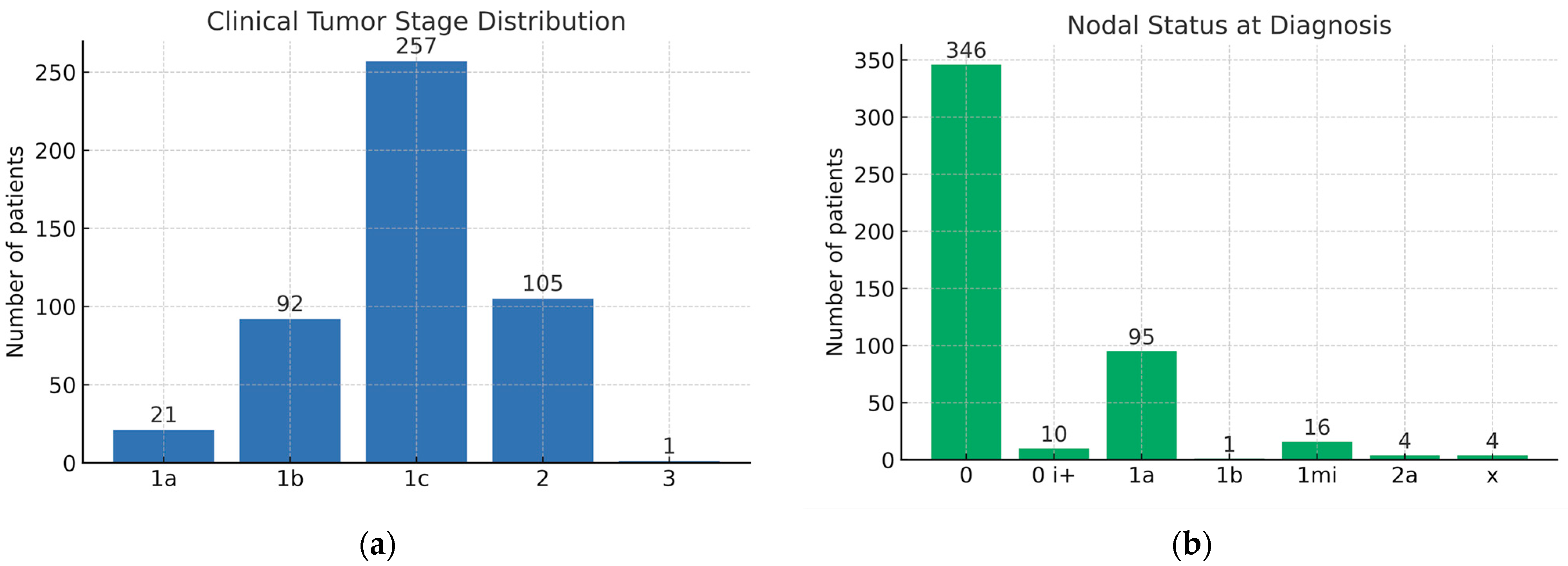 In our cohort, the clinical tumor stage (T) distribution was as follows: T1c in 257 patients (54.0%), T1b in 92 (19.3%), T2 in 105 (22.1%), T1a in 21 (4.4%), and T3 in 1 case (0.2%), as shown in