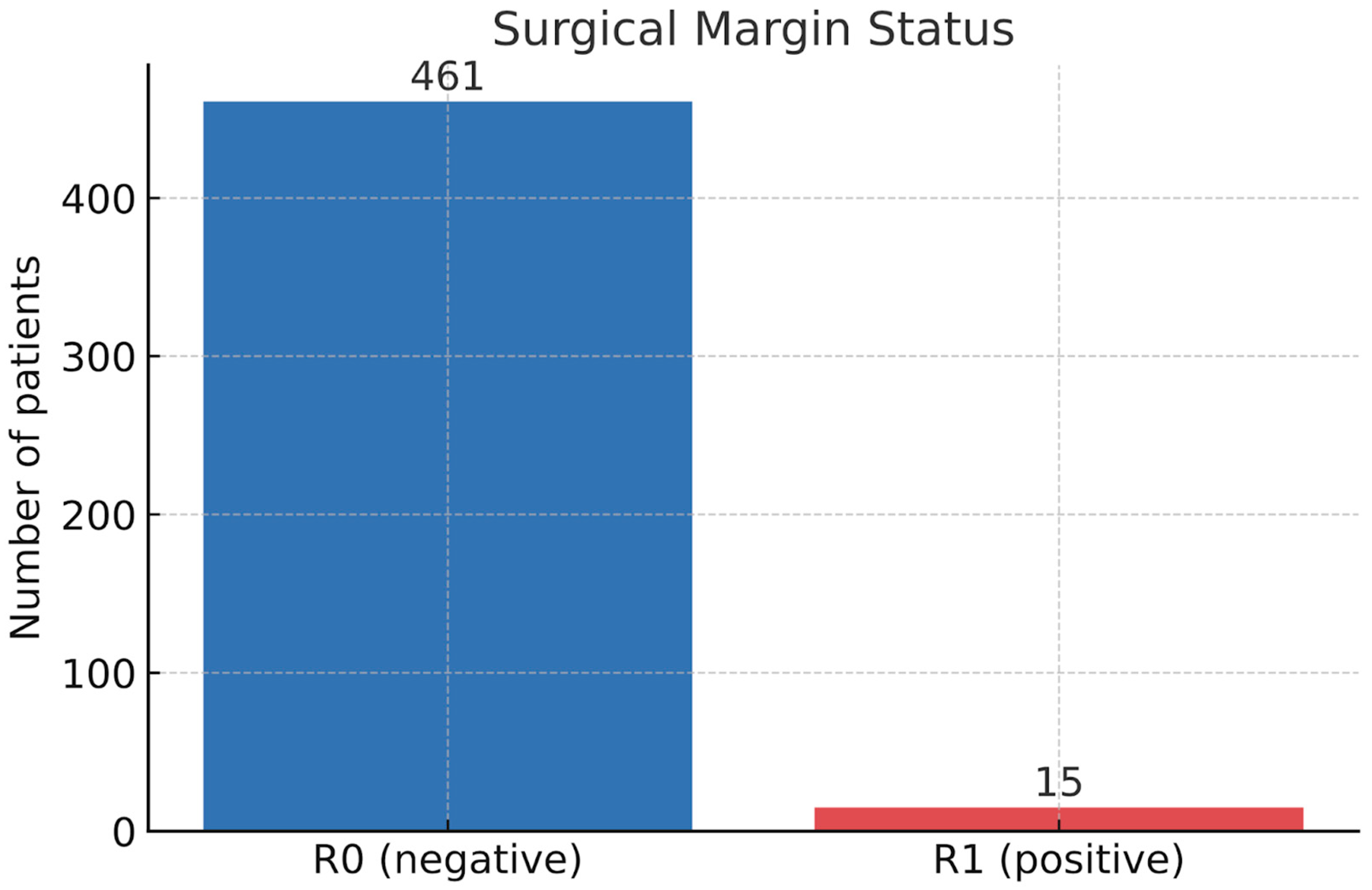 In terms of surgical margins status, negative margins (R0) were reported in 461 patients (96.8%), while the remaining 15 patients (3.2%) had positive margins (R1), as shown in