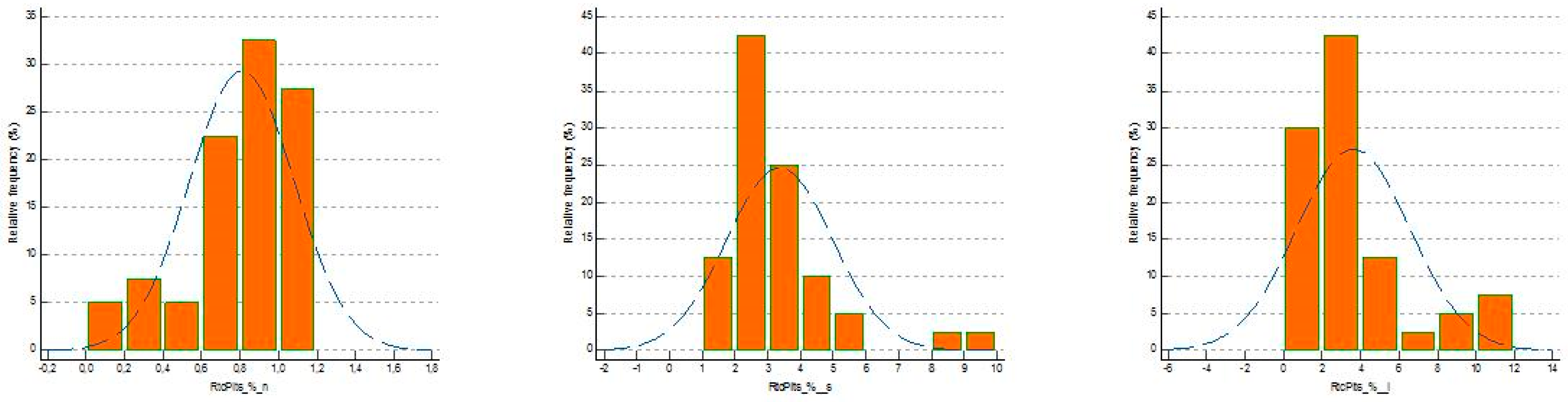 The difference in the distribution of values was confirmed by the display of frequency distribution histograms (%) (Figure 1) and the boxplot of concentrations (Figure 2).