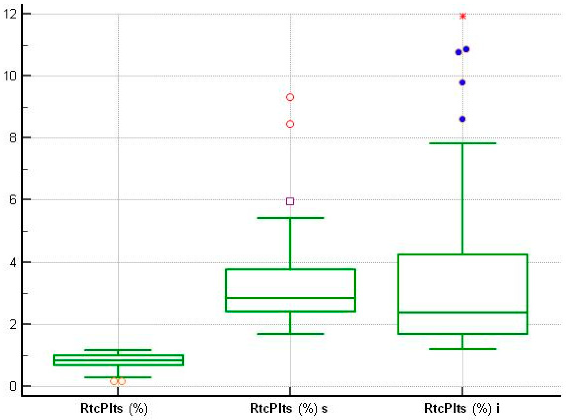 The visualization of the frequency distribution histograms (%) (Figure 1) and the concentration boxplot (Figure 2) confirmed the difference in the distribution of RtcPlts (%) values in patients with ACS at onset compared to control subjects.