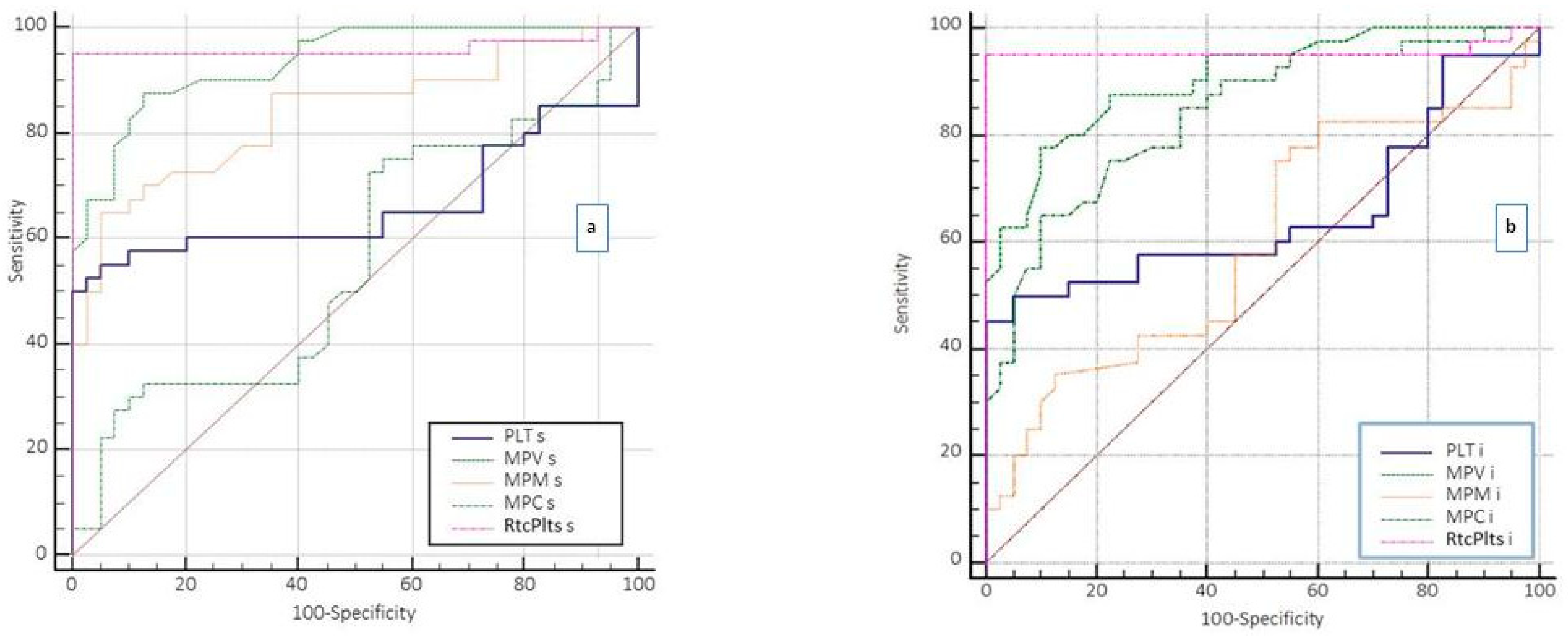 The platelet indices MPV and MPM RtcPlts (%), obtained by us with the Siemens ADVIA 2120 hematology system, are sensitive indicators of platelet activation, and can be of crucial importance for the interpretation of laboratory results and for the clinical decision-making process, but they do not discriminate the etiopathogenetic mechanism of platelet activation. PLT, MPV, MPM, MPC and RtcPlts (%), although modified in the pathological conditions evaluated, did not show a statistically significant difference (p > 0.05) between the medians obtained in patients with suspected sepsis at onset and patients with ACS at onset [20,24,38,46]. It is the inflammatory state that sepsis and ACS at onset have in common, probably linked to the rapid release of cytokines, which contributes to increasing the level of immature and reticulated platelets without allowing a differentiation between the clinical conditions [22,47] or providing any prognostic value.