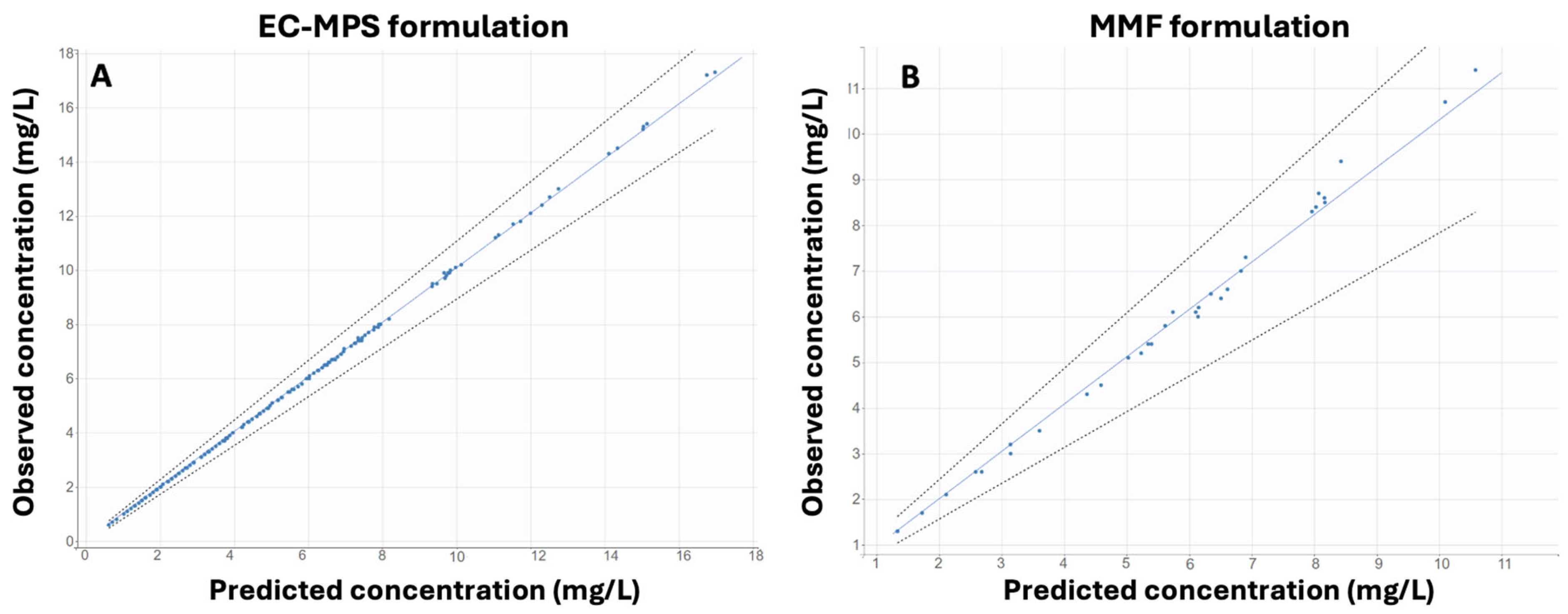- Wang, P.; Xie, H.; Zhang, Q.; Tian, X.; Feng, Y.; Qin, Z.; Yang, J.; Shang, W.; Feng, G.; Zhang, X. Population Pharmacokinetics of Mycophenolic Acid in Renal Transplant Patients: A Comparison of the Early and Stable Posttransplant Stages. Front. Pharmacol. 2022, 13, 859351. [Google Scholar] [CrossRef] [PubMed]