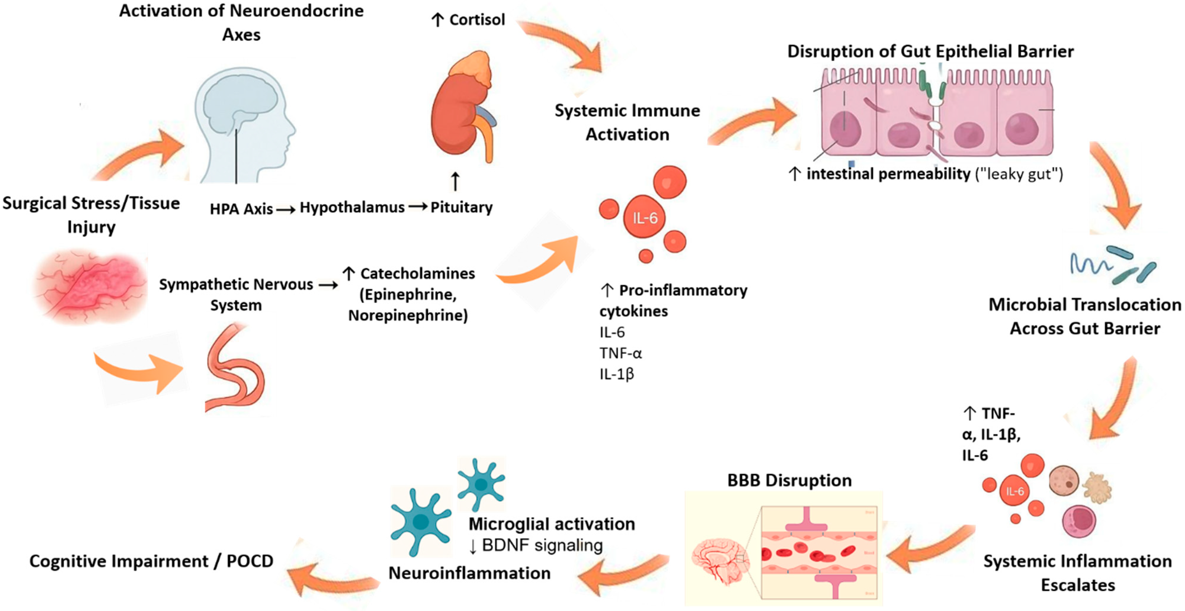 2. Surgical Stress, Neuroinflammation, and Gut Dysbiosis