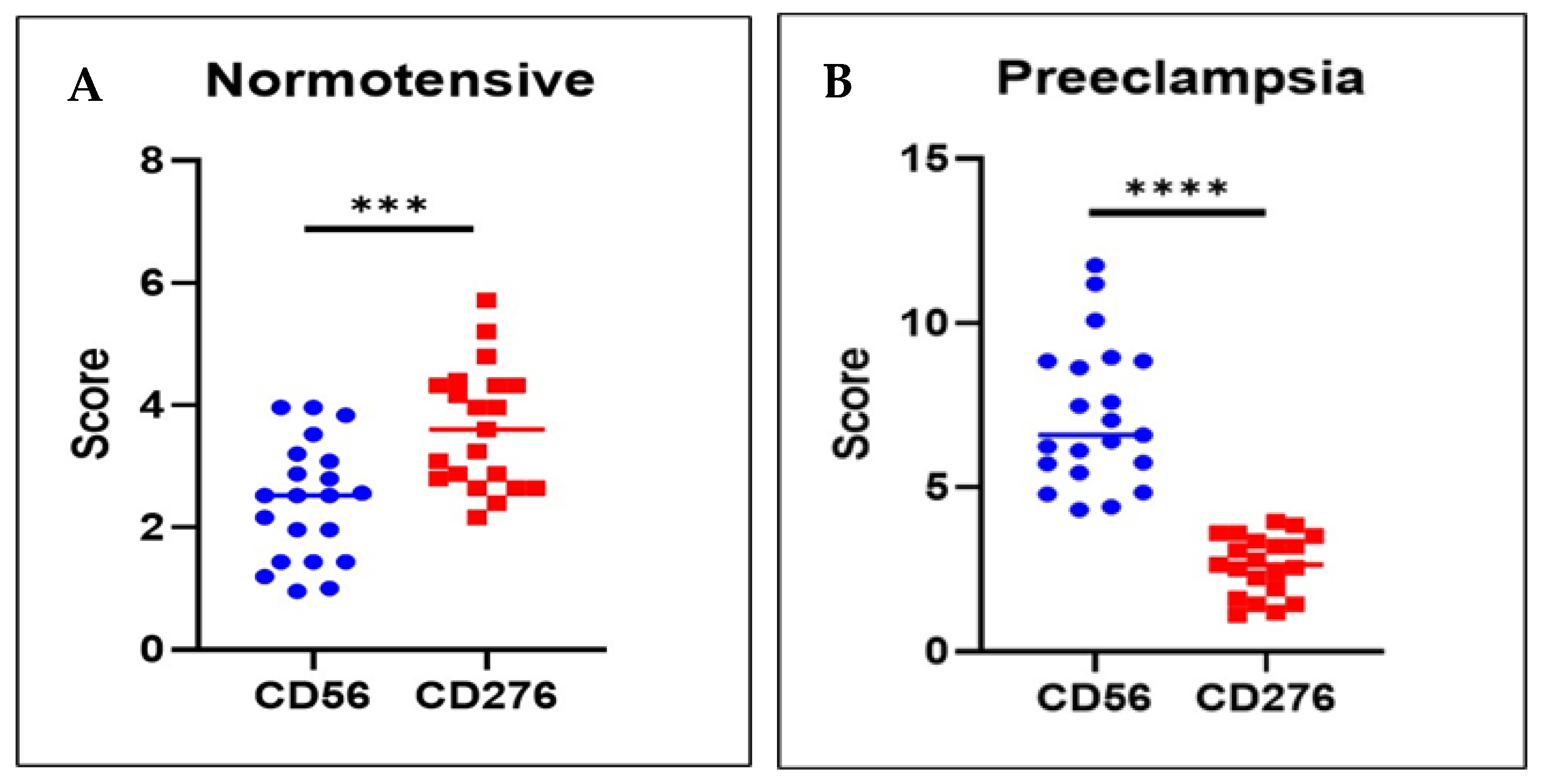 3.1. dNK Cell Expression Was Higher in the Preeclamptic Placenta than in the Normotensive Placenta