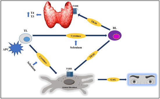 Trying to explain the beneficial effect of selenium on GBD and GBD orbitopathy can be difficult, given the biological and molecular complexity of AITD. GBD originates from the loss of host tolerance toward the TSHR, and TL activation induces the synthesis and secretion of inflammatory cytokines and the release of chemokines by thyroid follicular cells, generating an amplified inflammatory response, with an increase in the synthesis and secretion of TRAb [3,5,41].