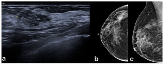 A 46-year-old woman with a 10-year history of oral contraceptive use. (a) Targeted breast ultrasound of the upper outer quadrant of the right breast shows an 18 mm hypoechoic area with scattered echogenic foci (yellow dotted line). (b,c) Digital mammography, craniocaudal and mediolateral oblique views, demonstrates a corresponding 2 cm lesion associated with clustered microcalcifications.