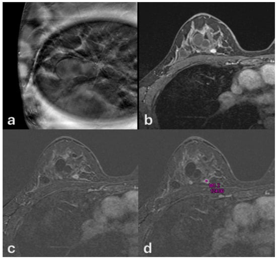 Contrast-enhanced MRI corespective for targeted breast ultrasound and digital mammography of patient of Figure 1. Contrast-enhanced dynamic MRI (a–c) depicts gradual enhancement without washout, consistent with a type II kinetic curve. Histopatology confirmed low-grade ductal carcinoma in situ (DCIS), despite the 2 cm radiological extension.