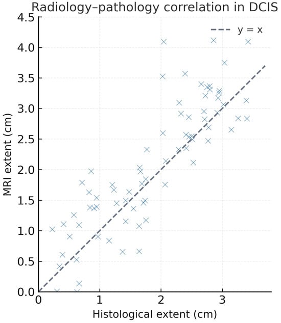 Correlation between MRI-estimated lesion extent and histological measurements in 75 patients with DCIS. A moderate positive correlation was observed (Pearson’s r = 0.62, p < 0.001). The scatter plot demonstrates a tendency for MRI to overestimate disease size compared with pathology. The dashed line indicates the line of identity (y = x).