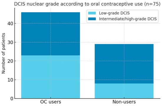 Distribution of DCIS nuclear grade according to oral contraceptive (OC) exposure in 75 patients. Among OC users (n = 46), low-grade DCIS was observed in 23 cases, whereas among non-users (n = 29), low-grade disease was documented in 8 cases.