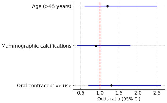 The logistic regression analysis, summarized in the forest plot (Figure 5), did not identify age, presence of calcifications, or OC exposure as independent predictors of MRI kinetic behavior. This result indicates that imaging enhancement patterns are likely influenced by intrinsic tumor biology rather than patient-level risk factors.