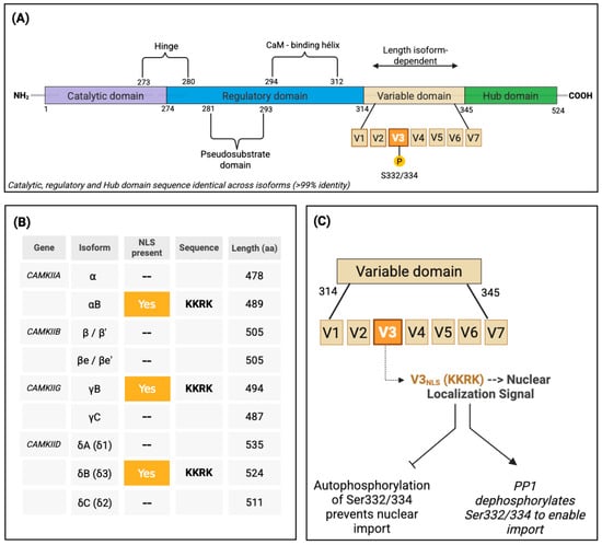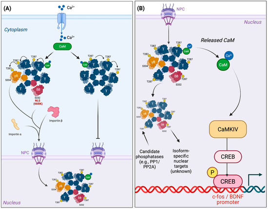Unlike transcription factors or chromatin kinases that carry prototypical NLS motifs, most CaMKII isoforms lack canonical import sequences [18,20]. This is particularly true for α and β, which dominate in neurons and remain excluded from the nucleus under basal conditions. These isoforms are effectively non-nuclear unless recruited by association. In contrast, specific splice variants of γ and δ isoforms incorporate a positively charged motif (KKRK) encoded by alternative exons. This NLS, best characterized in CaMKIIδB (δ3), also appears in γB and αB, indicating a conserved strategy of regulated nuclear targeting across the CaMKII family [2,3,15,21,22]. Yet the presence of an NLS is not sufficient for import. Phosphorylation adjacent to the motif—particularly at Ser332 (δB) or Ser334 (γB)—masks the import signal and prevents nuclear entry [13,15]. Kinases such as CaMKI and CaMKIV act as gatekeepers, while dephosphorylation by protein phosphatase 1 (PP1) restores access [13,15,23,24]. This phospho-switch integrates calcium oscillations with transcriptional gating, making localization—not just activation—a defining aspect of CaMKII function (Figure 1) [17].