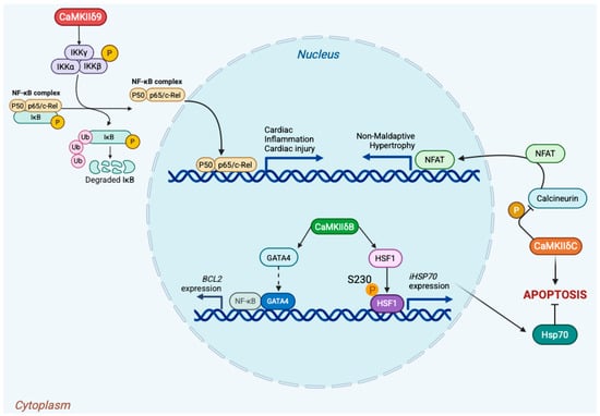 Isoform-specific nuclear targets of CaMKII in cardiomyocytes. CaMKIIδ9 activates the NF-κB pathway by phosphorylating the IKK complex, leading to IκB degradation and p65/p50 nuclear translocation, thereby promoting inflammatory and injury-responsive gene expression [6,7]. In parallel, nuclear CaMKIIδB phosphorylates transcriptional regulators: it enhances GATA4-dependent activation of the BCL2 promoter and modifies HSF1 at Ser230, inducing iHSP70 expression and cytoprotection [37,38] By contrast, cytosolic CaMKIIδC phosphorylates calcineurin A, restraining NFAT nuclear translocation and thereby antagonizing maladaptive hypertrophy [40] Together, these isoform-specific programs couple calcium signals to pro-survival, inflammatory, and anti-hypertrophic transcriptional outputs in the stressed heart.