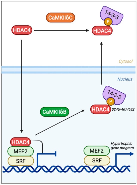 Nuclear CaMKII reshapes the epigenetic landscape by targeting class IIa histone deacetylases (HDACs), transcriptional repressors that gate access to MEF2-dependent programs. Among these, HDAC4 is the best-characterized substrate in excitable tissues: it binds MEF2 at promoter-proximal chromatin and enforces repression of genes involved in growth, differentiation, and adaptive remodeling [5,41,42]. CaMKIIδB interacts with HDAC4 through a dedicated docking site and phosphorylates it at Ser246, Ser467, and Ser632, creating 14-3-3 binding motifs that mask the NLS and expose the NES. This promotes nuclear export of HDAC4 and derepression of MEF2 activity (cultured mouse cardiomyocytes) [5,41,42,43]. In cardiomyocytes, CaMKII activity is required for agonist-induced cytosolic accumulation of HDAC4, and HDAC4 mutants resistant to CaMKII phosphorylation blunt hypertrophic gene expression, establishing the CaMKII→HDAC4→MEF2 axis as a driver of pro-hypertrophic transcription. This mechanism is summarized in Figure 4, highlighting how CaMKIIδB, but not δC, sustains epigenetic remodeling by regulating HDAC4 nuclear export and MEF2/SRF-driven transcription [5].