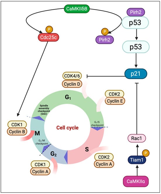 CaMKII isoforms integrate cell-cycle progression and checkpoint control. Nuclear CaMKIIδB phosphorylates Cdc25C, promoting CDK1/Cyclin B activation and mitotic entry, while simultaneously stabilizing p53 via Pirh2 phosphorylation, enhancing p21-mediated checkpoint arrest under stress. In parallel, CaMKIIα facilitates G1/S progression by phosphorylating Tiam1 and activating Rac1, thereby reducing p21 inhibition and enhancing Rb/E2F-dependent transcription control.