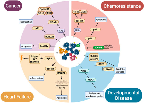 Taken together, these observations position nuclear CaMKII isoforms as central nodes in pathological rewiring across cancer, chemoresistance, heart failure, and developmental disorders. A schematic overview of these isoform-specific mechanisms and disease outcomes is presented in Figure 6.