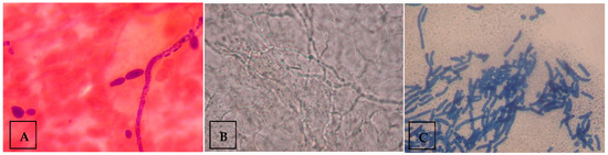 For microscopy samples, skin samples were placed onto a clean glass slide with 15% potassium hydroxide (KOH) solution and mounted with a coverslip. The slide was then placed on a warm heater of 50 °C for five minutes to soften the material. The preparation was then examined under low-power magnification (10×). Fungal elements or spores, if any, were then confirmed using a higher-power magnification (40×). The visualization of fungal morphology indicated a positive sample, while the absence of it indicated a negative sample. The presence of budding yeast cells with pseudohyphae on microscopy was considered diagnostic of Candida species (Figure 1A), whereas visualization of mycelia indicated dermatophytes (Figure 1B), and the presence of both spores and hyphae suggested Malassezia species (Figure 1C). Samples demonstrating spores and hyphae, consistent with Malassezia furfur, were excluded from culture, as routine laboratory protocols do not include culturing for M. furfur.