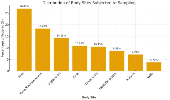 A total of 268 samples were collected from 149 patients who underwent fungal scraping between September and December 2022. The age range was between 21 and 83 years (SD = 17.0). Among the 149 patients, 77 (51.7%) had two or more areas from different sites of the body subjected to skin sampling (Table 1). A total of 72 (26.9%) samples were taken from the feet, 49 (18.28%) from the trunk, back, and abdomen, 38 (14.18%) from the upper limbs, 29 (10.82%) from the groin, 28 (10.45%) from the lower limbs, 23 (8.58%) from the head, face, and neck, 19 (7.09%) taken from the buttock, and 10 (3.73%) from the axilla (Figure 2).