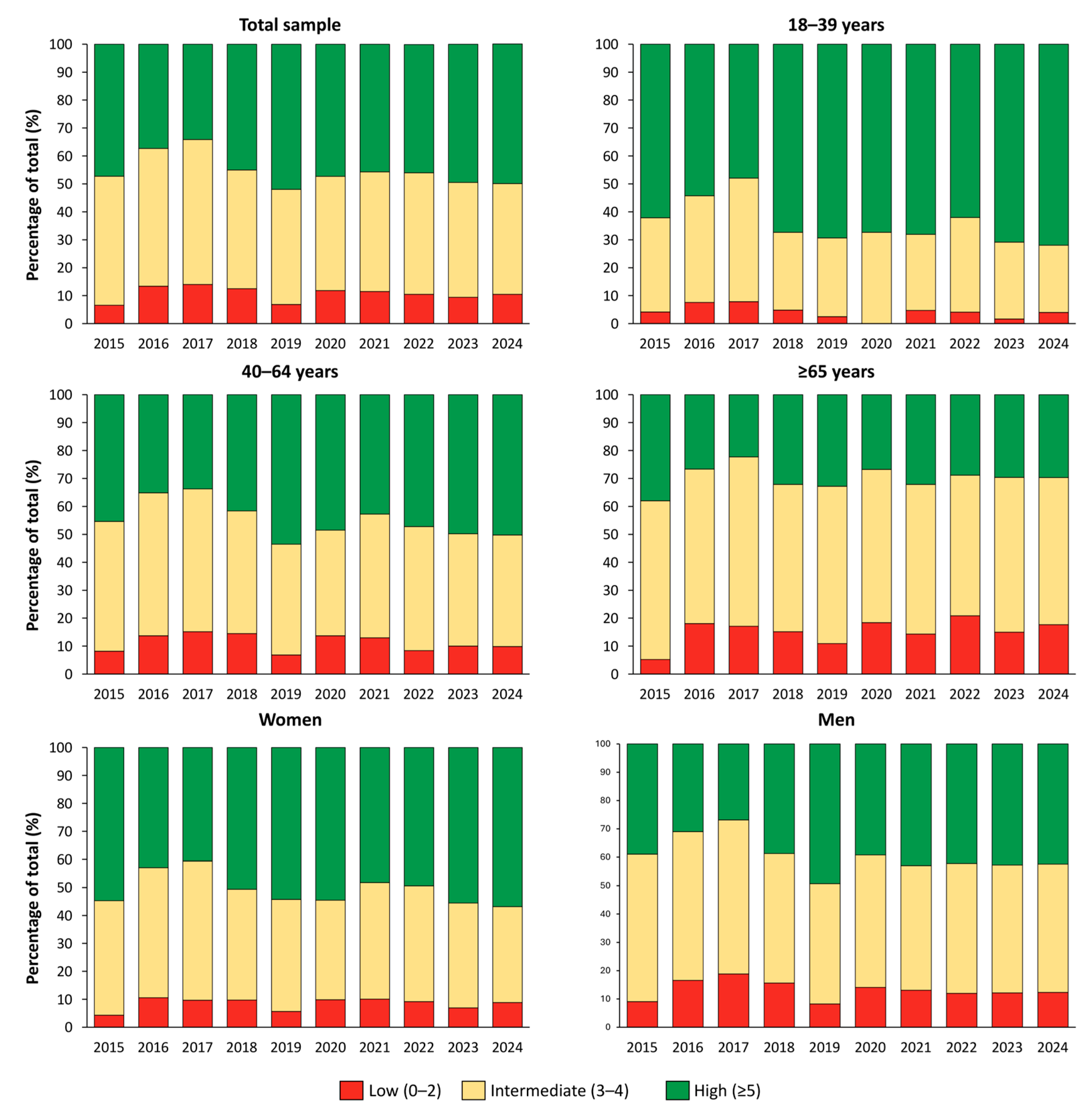 Cacciatore, S.; Levati, E.; Calvani, R.; Tosato, M.; Ciciarello, F.; Galluzzo, V.; Salini, S.; Russo, A.; Marzetti, E.; Landi, F., on behalf of the Lookup 8+ Study Group. Temporal Trends in Cardiovascular Health Metrics in Italy, 2015–2024: A Ten-Year Report from the Longevity Check-Up (Lookup) 8+ Study. Med. Sci. 2025, 13, 251. https://doi.org/10.3390/medsci13040251
