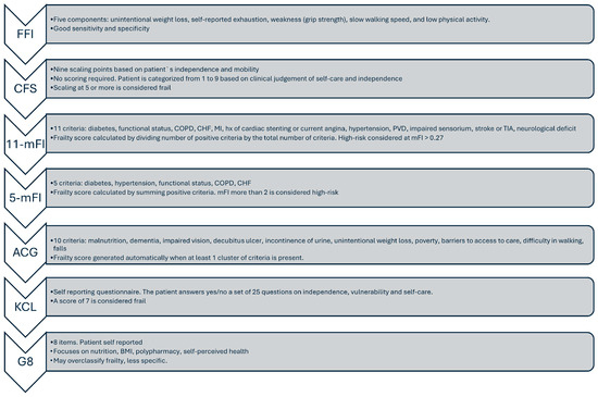 | Geriatric-8 (G8) | Screening tool | 8 items; mostly patient-reported | Focuses on nutrition, BMI, polypharmacy, self-perceived health | Good sensitivity for frailty screening in cancer patients | May overclassify frailty; less specific |