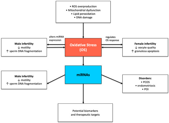 The present review examines how OS-regulating miRNAs influence male and female infertility through their effects on redox homeostasis, cellular metabolism, apoptosis, steroidogenesis, and gametogenesis. This study reveals that various miRNAs become dysregulated in polycystic ovary syndrome (PCOS), premature ovarian insufficiency (POI), endometriosis (OEM), varicocele and age-related reproductive decline, thus indicating their fundamental role in reproductive dysfunction caused by oxidative stress. Figure 1 presents a schematic representation of the bidirectional relationship between OS and miRNAs in human infertility. Certain studies underscore the crucial role of miRNAs such as miR-146a and miR-155 in various conditions. MiR-146 was found to protect against OS-induced ovarian dysfunction [57] and miR-155 is a potential marker of subfertility in men [57].