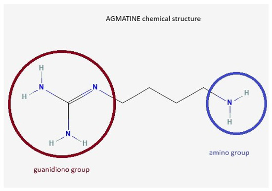 Agmatine (AG) is an endogenous neurotransmitter identified by Albrecht Kossel in 1910 [1], involved in cognitive functions, learning, and memory [2]. It is synthesized from L-arginine under the action of the enzyme arginine decarboxylase [3,4,5]. Other arginine precursor compounds are nitric oxide (NO), citrulline, and ornithine [6]. The chemical structure of AG contains a guanidino group and an amino group (Figure 1).