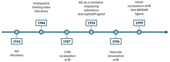 An overview of the main discoveries involving AG. In 1910, Albrecht Kossel isolated the AG in herring sperm [1]. In 1984, Bousquet et al. [15] introduced the concept of imidazoline binding sites [15]. In 1987, Ernsberger et al. [16] showed the CNS localization of imidazoline binding sites [16]. In 1994, AG was proposed as a clonidine-displacing substance and an alpha2R ligand [17]. In 1996, imidazoline binding sites were identified on vascular smooth muscle and endothelium [18]. In 1999, imidazoline binding sites were identified in cardiovascular tissues [19], and AG is a ligand for NMDARs [20]. AG, agmatine; CNS, central nervous system; IR, imidazoline receptors; NMDAR, N-methyl-D-aspartate receptors; alpha2R, alpha-2 adrenergic receptors.