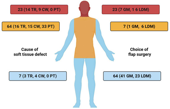Anatomical distribution of free muscle flap reconstructions (GM = Gracilis muscle, LDM = Latissimus dorsi muscle), stratified by defect etiology: tumor resection (TR), chronic wounds (CW), and post-traumatic injuries (PT) TR = tumor resection, CW = chronic wound, PT = post-traumatic.
