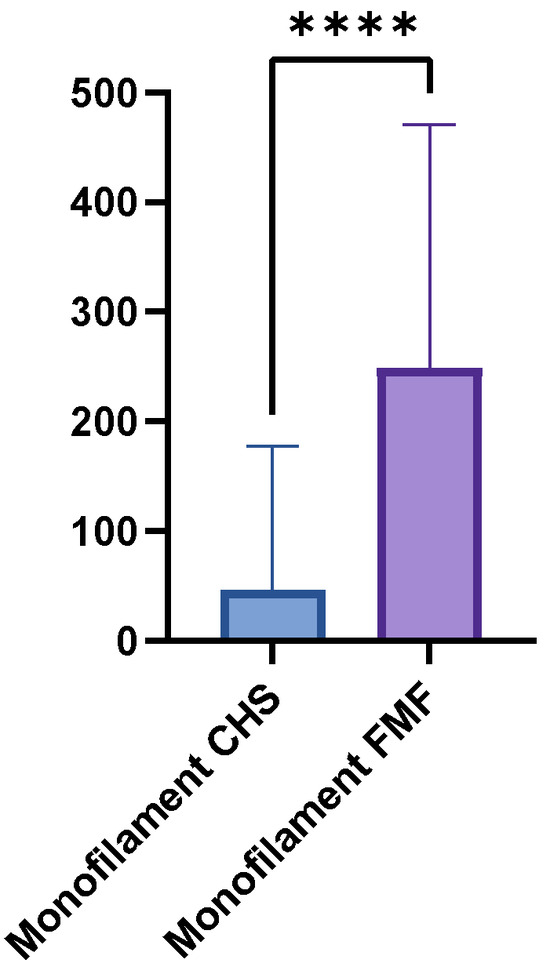 Boxplot comparing Semmes-Weinstein monofilament thresholds in FMF tissue versus CHS. Higher thresholds indicate reduced pressure sensitivity (p < 0.0001). **** = extremely significant.