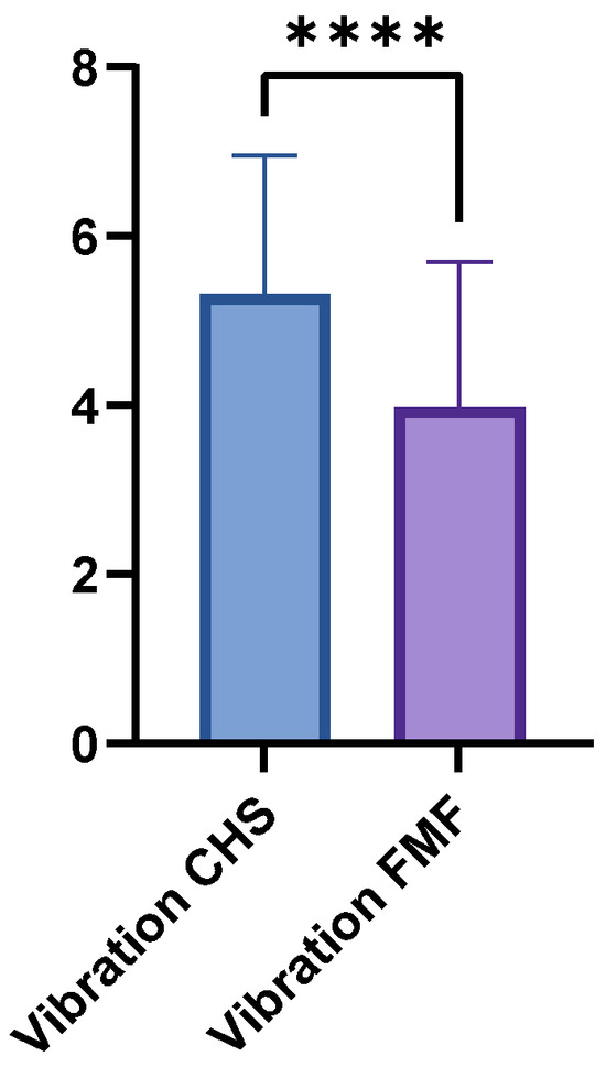 Comparison of vibration sensation scores between FMF and CHS tissues. FMF scores were significantly reduced across all regions (p < 0.0001). **** = extremely significant.