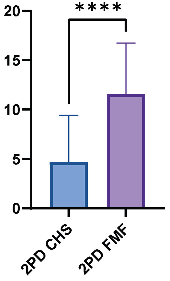 The FMF group had a higher mean 2PD value of 11.60 cm (±5.15, range 0.8–15.0 cm), while the CHS group had a significantly lower mean value of 4.71 cm (±4.70, range 0.5–15.0 cm). The mean difference between the two groups was 6.88 cm (p < 0.0001) (Figure 5). The GM flaps showed significantly higher 2PD than the LDM flaps (p < 0.0001).