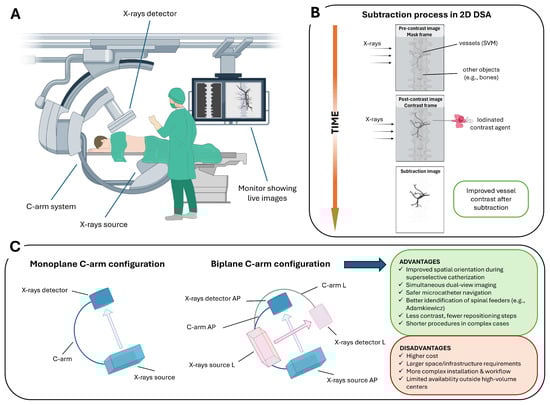 2D DSA workflow and C-arm configurations for SVMs: (A) C-arm angiography system used for spinal procedures, including an X-ray source, detector, and real-time fluoroscopic imaging display. (B) Schematic of the subtraction process in 2D DSA. A pre-contrast mask frame is acquired, followed by a contrast-enhanced frame; digital subtraction suppresses background structures (e.g., bone), enhancing visualization of spinal vascular malformations. (C) Monoplane versus biplane C-arm configurations. Biplane systems provide simultaneous orthogonal projections (anteroposterior, AP, and lateral, L), improving catheter navigation and anatomical orientation in complex SVMs, at the cost of increased system complexity and infrastructure requirements.
