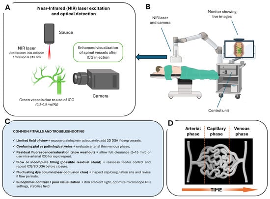 Intraoperative ICG videoangiography (ICG–VAG) workflow and principles: (A) NIR excitation and optical detection principle. Following intravenous administration of ICG, vessels are illuminated with NIR light, producing green fluorescence that allows real-time visualization of spinal vasculature. (B) Intraoperative setup with NIR laser/camera system and live image display integrated into the surgical microscope control unit. (C) Common pitfalls and troubleshooting strategies, including limited field of view, residual fluorescence, incomplete filling, near-occlusion signs, and optimization of contrast and visualization. (D) Schematic representation of the arterial, capillary, and venous phases over time following ICG injection.