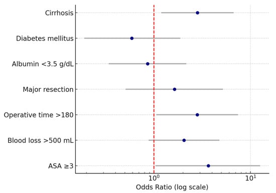 Taken together, these studies converge on a consistent set of risk factors—ASA status, presence of advanced liver disease (cirrhosis or portal hypertension), operative time, and intraoperative blood loss—that appear to transcend geographic regions, surgical approaches, and patient subgroups [4,33,34,35]. They also provide a strong conceptual basis for the findings of the present analysis.