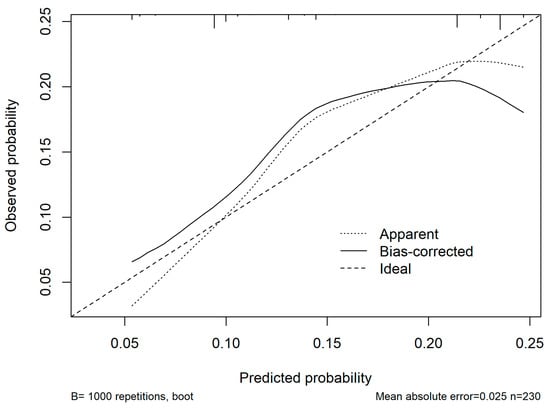 Calibration curve of the nomogram model for predicting postoperative medical complications. The x-axis represents predicted probabilities, and the y-axis represents the observed probabilities of complications. The dashed diagonal line indicates perfect calibration (ideal model), where predicted and observed risks are identical. The dotted line represents the apparent calibration of the model in the original dataset, while the solid line represents the bias-corrected performance after 1000 bootstrap resamples. The bias-corrected curve closely follows the ideal line across most probability ranges, indicating good agreement between predicted and observed risks with minimal overfitting (mean absolute error = 0.025).
