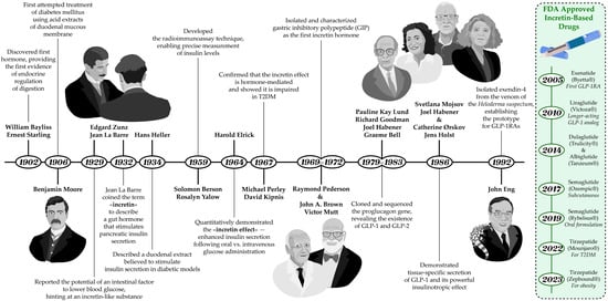 Timeline of key discoveries in incretin biology and therapy development. The figure highlights the identification of GIP and GLP-1 as incretin hormones, the demonstration of their insulinotropic effects, and the subsequent development of incretin-based drugs, including GLP-1RAs and DPP-4 inhibitors, which transformed diabetes treatment. The illustration of J. La Barre is shown from behind because his photograph is not available in the public domain on the internet, as is the case with the photograph of R. Pederson, who was decided not to be depicted.