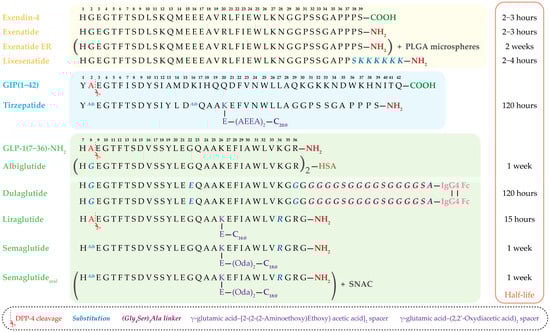 Amino acid sequences of clinically used and approved incretin-based drugs. The figure presents exendin-4–derived agents (exenatide, extended-release exenatide (ER), lixisenatide), human GLP-1 analogs (albiglutide, dulaglutide, liraglutide, semaglutide, oral semaglutide), and the dual GIP/GLP-1 receptor agonist tirzepatide. The corresponding plasma half-lives of each drug are shown on the right. Sites of DPP-4 cleavage, amino acid substitutions, and structural modifications—including fatty acid side chains, linkers, albumin- and Fc-fragment fusion—are indicated, highlighting strategies to enhance resistance to enzymatic degradation, prolong half-life, and improve pharmacokinetic properties. PLGA—Poly(lactic-co-glycolic acid), HSA—Human Serum Albumin, C16:0—Palmitic acid, C18:0—Stearic acid, C20:0—Arachidic acid, IgG4 Fc—Fc-fragment of human immunoglobulin G4, (Oda)2—(2,2′-Oxydiacetic acid)2, (AEEA)2—[2-(2-(2-aminoethoxy) ethoxy) acetic acid]2, SNAC—sodium N-[8-(2-hydroxybenzoyl)aminocaprylate].