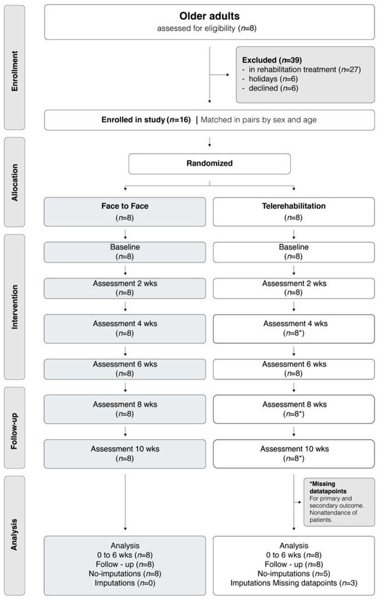 Flow diagram of the prospective, randomised controlled trial with matched-pairs allocation in older adults. wks = weeks. * Missing datapoints. Other options: Missing datapoints for primary and secondary outcome.